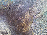 The rather garish colours were the choice of Jean's cleaner who helped her to put the packs together. Not my choice so I have attached the piece to a strip of old pelmet vilene, covered it with expanda print, zapped it with the heat gun, covered it with gesso, ink and spray paint and it is now drying and looking very different. I will post more photos when the sample is completed.